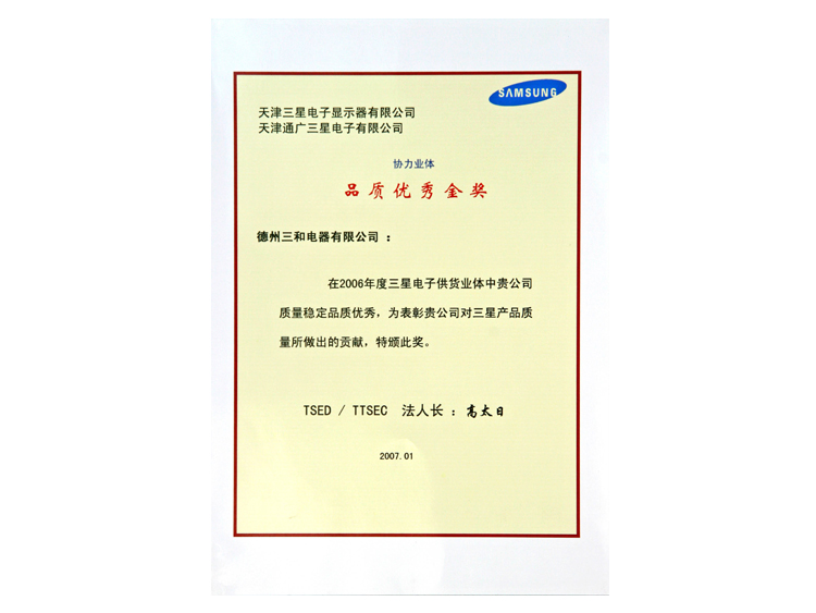 三星金獎證書